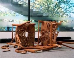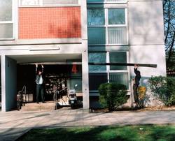 "One morning we removed one of the 7,5 m long tree trunk from the skott of "Objektes 13" and went with it through the Hansaviertel to the "Eternithaus". There, we have used the trunk to modify a number of chosen design furniture objects…"