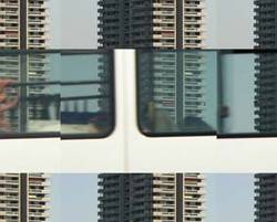 Im Bildhintergrund Hochhausetagen geschichtet, aus dem Nichts ragend. Davor rauschende Autos ohne Kontakt zum Boden. Die Fahrzeuge rasen durch die Luft, die Hochhäuser fußen im Bodenlosen, das gesamte Bild hängt in der Schwebe.